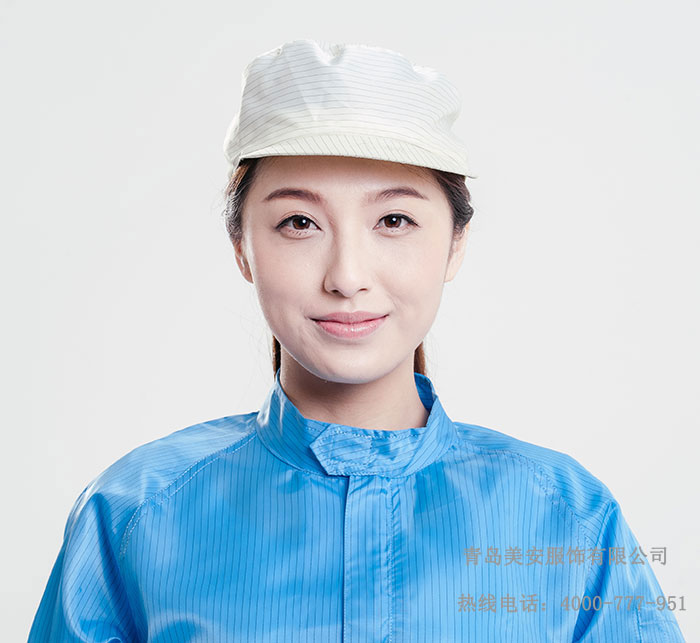 美安服饰防静电帽子是由专用的防静电洁净面料制作。此面料采用专用涤纶长丝,经向或纬向嵌织导电纤维。 具有高效、永久的防静电、防尘性能,薄滑,织纹清晰的特点。在制作成衣过程中采用专用的包缝机械,有效减少微粒的产生。无尘的粘扣带避免了因掉毛污染环境。根据级别要求提供不同款式,并采用导电纤维缝制,使防静电帽子各部分保持电气连续性,从而满足高级别无尘环境的要求。